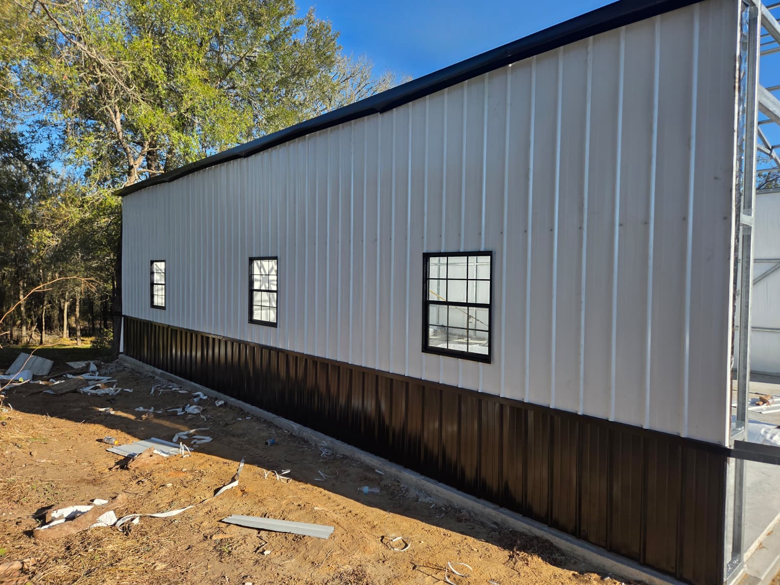 We offer barndominium shells — that means we build the red iron frame, exterior walls, and roof. You or your contractor handle the interior finish.